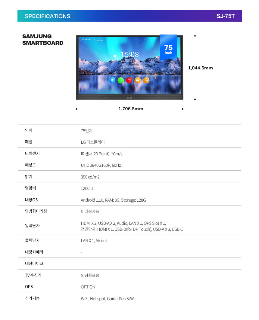 [삼정] 스마트보드 전자칠판 75인치 SJ-75T