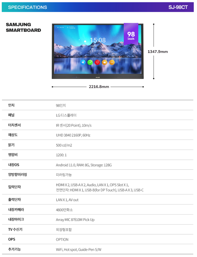 [삼정] 스마트보드 전자칠판 98인치 SJ-98CT