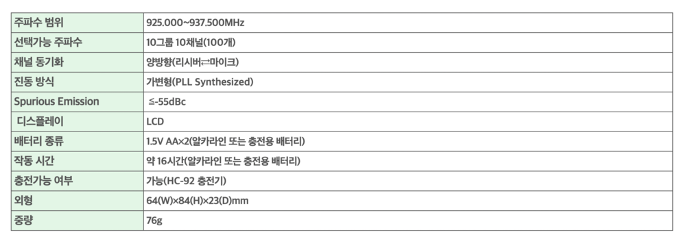 LCD 창에 채널, 주파수, 배터리 상태, 작동 파라미터 정보표시